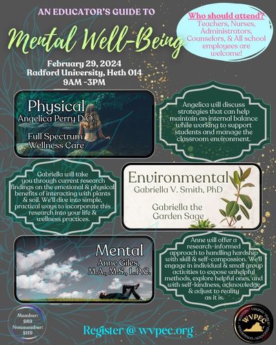 WVPEC cordially invites you to their professional development training "An Educator's Guide To: Mental Well-Being". This is a unique opportunity to dive into your mental well-being from three different perspectives, the physical, environmental, and mind. Working toward a healthier you. This workshop is focused on the educator, their needs, and how they can better support themselves.